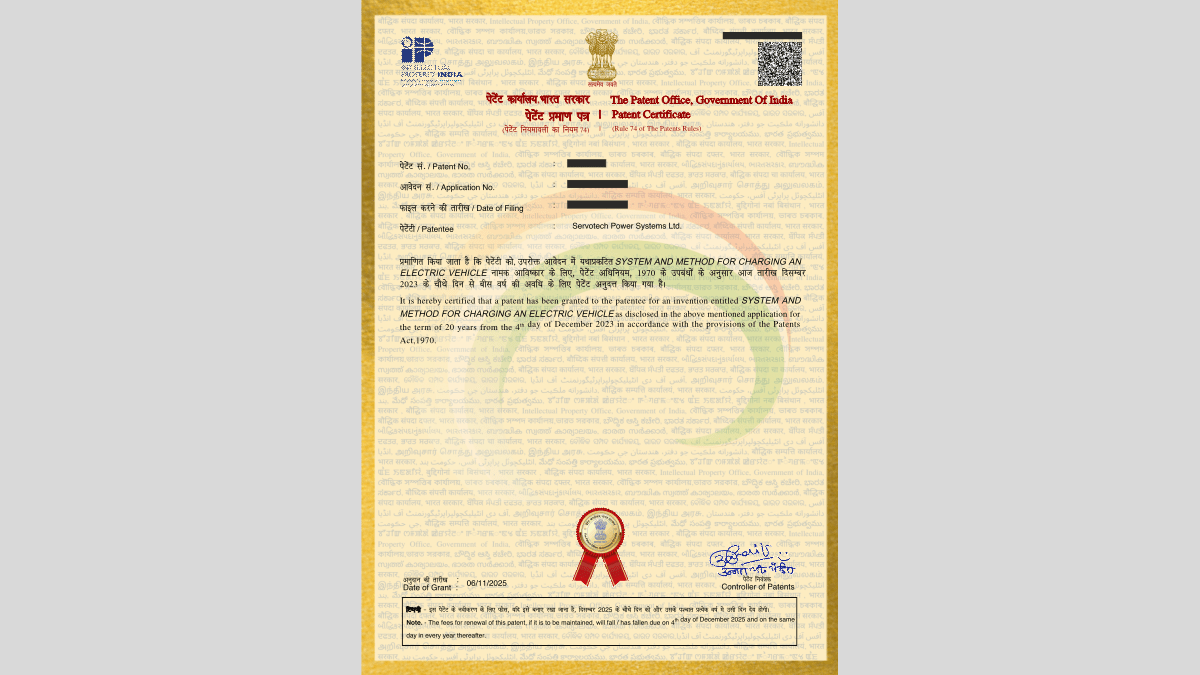 New Delhi, 25th November 2025: Servotech Renewable Power System Ltd. (NSE: SERVOTECH), India’s leading EV chargers manufacturer and renewable energy solutions player, has been granted patent by the Indian Patent Office for its latest breakthrough innovation titled “System and Method for Charging an Electric Vehicle.” This patented technology marks a major advancement in India’s EV charging landscape, addressing one of the industry's most persistent compatibility challenges.
