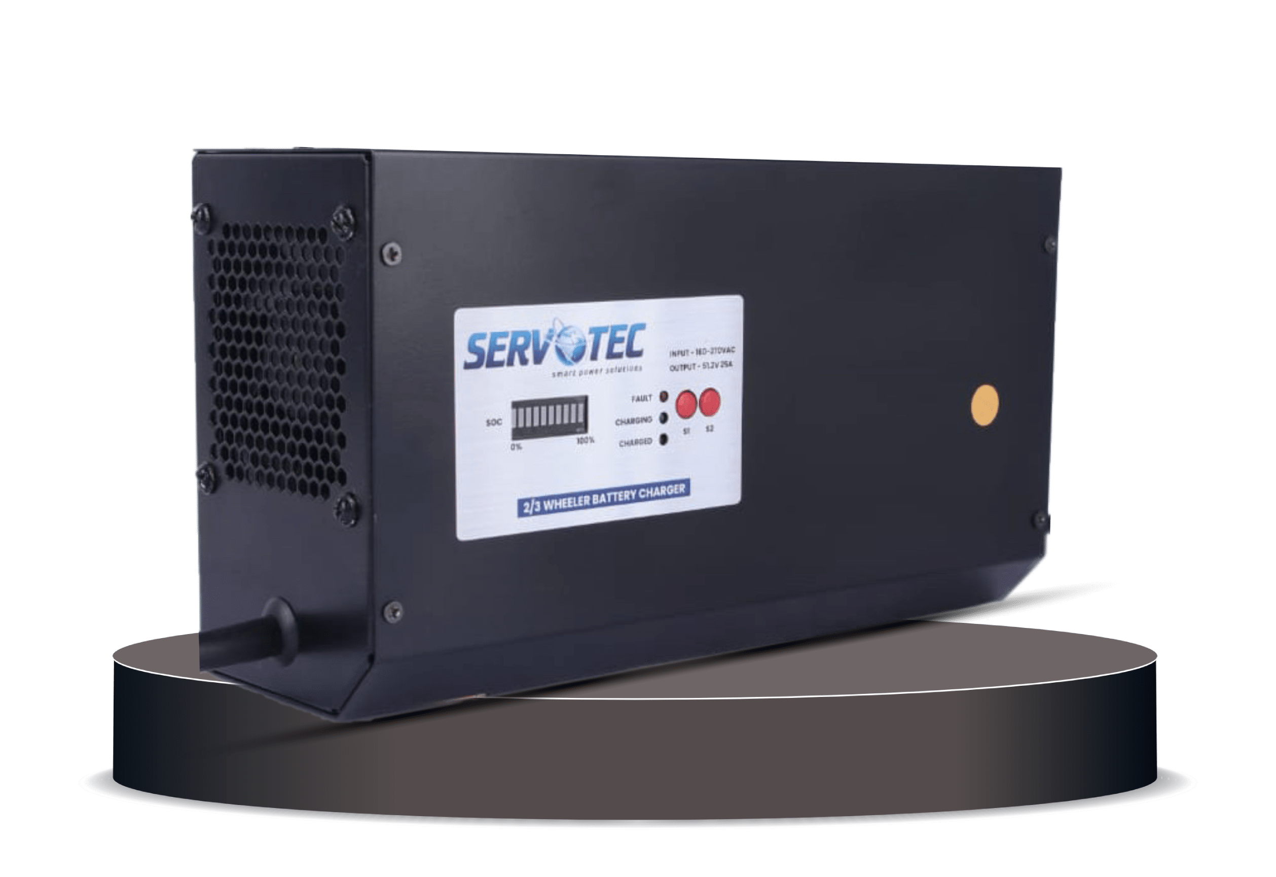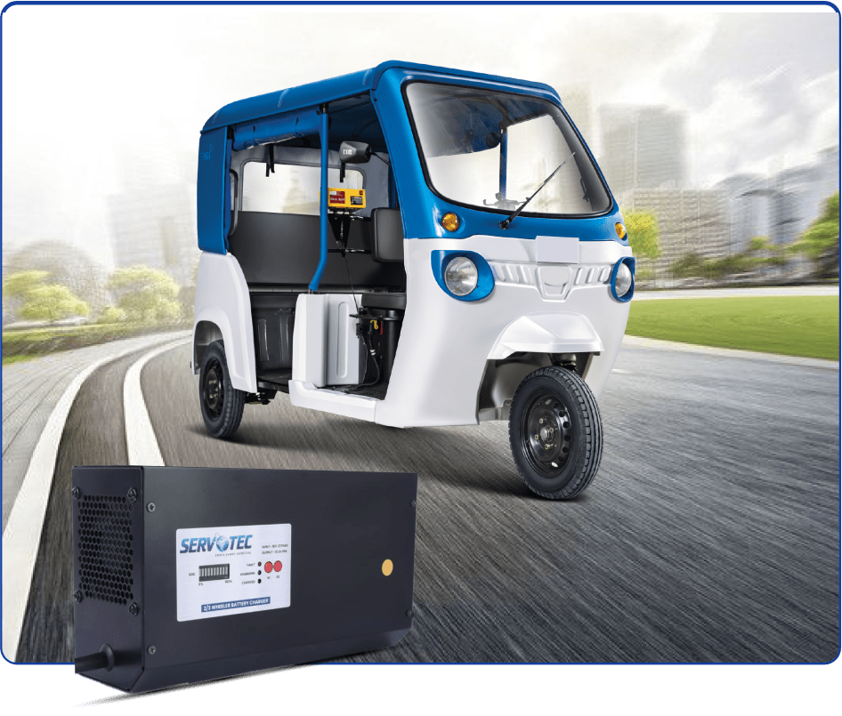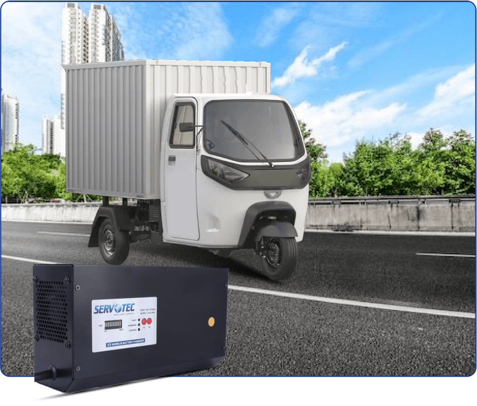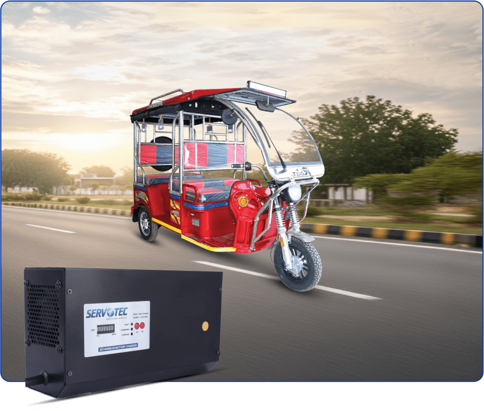 The Servotech 3-Wheeler Battery Charger is compatible with e-loaders, e-autos, and e-rickshaws, delivering stable, efficient, and safe charging. Designed to handle frequent plug-in cycles and long operating hours, it ensures faster charging, reduced downtime, and consistent performance across varied daily-use applications.