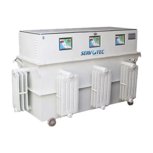 Servotech’s oil cooled Servo Stabilizers change the level of voltage in a clockwise or anti clockwise manner using a strong AC synchronous motor for precious voltage management. These three phase stabilizers have a long-lasting motor-controlled stabilization technology that ensures safe voltage delivery.